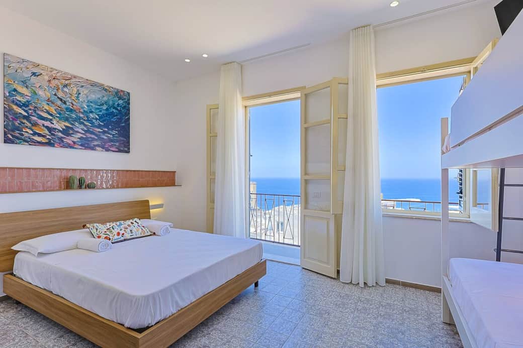 Balconi nelle camere Verde e Rosa, terrazza nella Blu: tetti, luce che cambia, e il mare sullo sfondo.